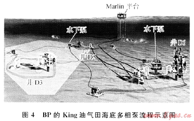 Henriot提出多相泵可用來消除嚴(yán)重段塞流[7]的方法。2007年英國石油公司(BP)在GOM的King油氣田水深1676m處安裝并啟用了2臺海底多相泵,其流程示意圖如圖4所示,在增壓和保證了油氣田產(chǎn)量的同時,也削弱了嚴(yán)重段塞流。