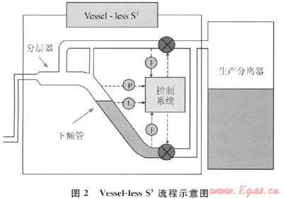 2004年Kovalev又提出了Vessel-lessS3[4]們的方法,其流程示意圖如圖2所示,通過1個體積更小的管道來替代原來的小型預(yù)分離器,流體在管道里完成了分層,液體下傾,氣體上升。