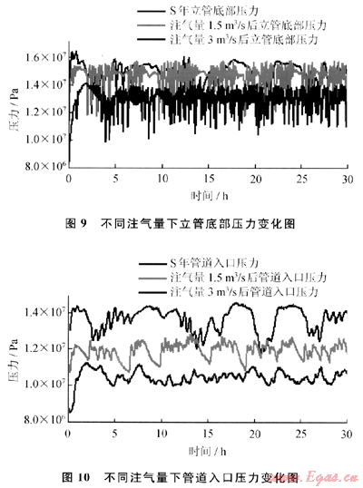 由圖10可知,隨著注氣量的增加,管道入口壓力明顯降低,這是由于注氣提供了舉升液體的能量,有利于提高油氣產(chǎn)量。