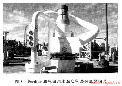 Song和Kouba提出了海底氣液分離[5]的方式,分離后氣液分輸至平臺,段塞流因此而被消除。2009年Henning報道Tordis、BC~10和Pazflor等油氣田都應(yīng)用了此技術(shù)[6]。2010年3月Shell在墨西哥灣(GOM)水深達2440m的Perdido油氣田投產(chǎn),意味著其應(yīng)用的深水海底氣液分離技術(shù)取得了成功,其海底氣液分離器如圖3所示。
