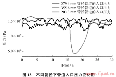 圖13為不同管徑下管道入口壓力的變化圖。由圖13可知,采用203.2mm管徑的管道時,需要的管道入口壓力高于采用279.4mm管徑的管道時的管道入口壓力,而采用355.6mm管徑的管道時,需要的管道入口壓力不僅較高,還會出現(xiàn)很大的波動。相比279.4mm管徑的管道而言,這2種管徑的管道都不利于提高油氣產(chǎn)量。