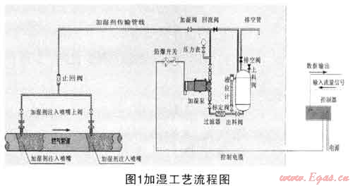 宜春深燃天然氣有限公司自2010年2月開始使用溶劑油加濕劑對(duì)天然氣進(jìn)行加濕,溶劑油加濕工藝設(shè)備主要由控制器、儲(chǔ)藥罐、加濕泵、各閥門組、壓力表及加濕噴嘴等組成,工藝如圖1所示: