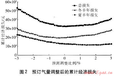 由圖2可知,在負調(diào)整比例區(qū)間,隨著燃氣預測調(diào)整幅度的增加,由于超提日數(shù)和超提氣量增加,超提損失的增長速度明顯大于欠提損失的降低速度,總損失快速增加;在正調(diào)整比例區(qū)間,隨著燃氣預測調(diào)整幅度的增加,由于欠提日數(shù)和欠提氣量增加,欠提損失的增長速度大于超提損失的降低速度,總損失逐步增加。冬半年經(jīng)濟損失與總經(jīng)濟損失變化趨勢基本相同,夏半年經(jīng)濟損失在調(diào)整比例為1.5%時最小。