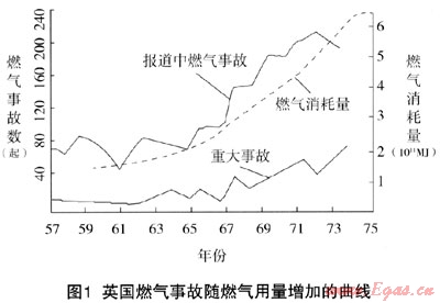 隨著我國城鎮(zhèn)燃?xì)馐褂玫钠占埃覂?nèi)燃?xì)馐鹿室矊映霾桓F,如何減少室內(nèi)燃?xì)馐鹿蕩淼纳鼈拓?cái)產(chǎn)損失是人們持續(xù)關(guān)注的焦點(diǎn)。統(tǒng)計(jì)表明,燃?xì)獗ǖ氖鹿蕯?shù)與燃?xì)庥脩艉腿細(xì)庀膸缀醭烧?,如圖1所示為英國燃?xì)馐鹿实慕y(tǒng)計(jì)。為了維護(hù)燃?xì)饪蛻舻纳?cái)產(chǎn)安全,有必要對(duì)事故的成因、規(guī)律及危害進(jìn)行分析以找出相應(yīng)的防范措施。本文就是探索這類事故產(chǎn)生和發(fā)展的規(guī)律,提出有效的預(yù)防和控制措施,解決目前燃?xì)庑袠I(yè)亟待解決的居民用戶安全問題,因此具有重大的社會(huì)經(jīng)濟(jì)效益。