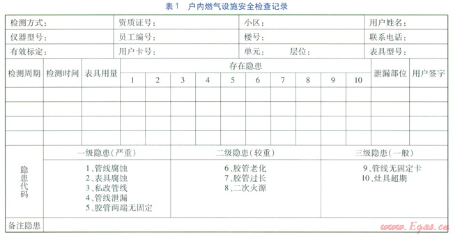 鑒于以上思路,以戶內(nèi)安檢崗位為例,在戶內(nèi)發(fā)生爆炸、爆燃等事故后,相關(guān)部門首先要對燃?xì)膺\(yùn)營部門是否按國家標(biāo)準(zhǔn)執(zhí)行檢查,是否落實(shí)檢查工作等問題進(jìn)行核實(shí),那么核實(shí)的依據(jù)就是戶內(nèi)燃?xì)庠O(shè)施安全檢查記錄。我們通常的記錄只有檢查人、地點(diǎn)、時(shí)間、存在隱患、處理結(jié)果、處理人及用戶簽字等項(xiàng)目,看起來比較完善,但就筆者來看還是差強(qiáng)人意,只是提供了一些表面證據(jù),沒有體現(xiàn)出更深層面的法律效應(yīng)。例如:我們的員工有沒有檢查資質(zhì),有沒有使用專業(yè)的檢測設(shè)備,檢測設(shè)備是否按時(shí)標(biāo)定,設(shè)置在戶內(nèi)的燃?xì)庠O(shè)施有沒有超出使用年限,燃?xì)庠O(shè)施設(shè)置是否保持原始設(shè)計(jì)等,都沒有在記錄中體現(xiàn)。燃?xì)膺\(yùn)營管理者應(yīng)該對其進(jìn)行完善,并在記錄中直觀體現(xiàn),而這幾項(xiàng)問題想要在記錄中得到體現(xiàn)就需要運(yùn)營企業(yè)投入資金來支撐,要對職工進(jìn)行培訓(xùn)取得資質(zhì),購入檢測設(shè)備并按時(shí)標(biāo)定。而燃?xì)庠O(shè)施設(shè)置是否保持原始設(shè)計(jì)的問題,筆者認(rèn)為應(yīng)該列入設(shè)備檔案管理,即:對戶內(nèi)安裝的燃?xì)庠O(shè)施形成影像記錄,儲存在計(jì)算機(jī)內(nèi),可隨時(shí)調(diào)閱來及時(shí)掌握燃?xì)庥脩羰欠襁M(jìn)行過更改。戶內(nèi)燃?xì)庠O(shè)施安全檢查記錄見表1。