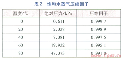 我公司橋東煤氣儲配站的人工煤氣來自邢臺旭陽焦化有限公司,經(jīng)過脫萘、脫硫凈化處理后,主要組成見表l。經(jīng)站區(qū)流量計計量,進入管網(wǎng),輸送至用戶,日均供氣量為17×104m3/d左右,用氣高峰期可達24×104m3/d。主干管采用DN 600mm的螺旋焊縫鋼管,長度約l0km,管網(wǎng)運行壓力為30~70kPa。在計量處測人工煤氣溫度,經(jīng)統(tǒng)計,濕煤氣的溫度不超過50℃,處于水飽和狀態(tài)。表2為0~80℃的飽和水蒸氣壓縮因子值[1]。由表2可知,當溫度不超過80℃,水蒸氣的飽和蒸氣壓很低,飽和水蒸氣壓縮因子與l的偏差小于1%,趨于理想氣體性質(zhì)。