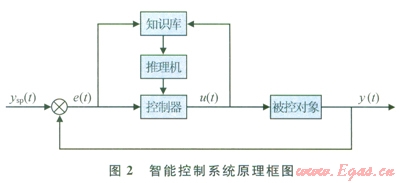 智能控制系統(tǒng)由知識(shí)庫、推理機(jī)及控制器組成,基本模型見圖2。圖2中u(t)為控制量,e(t)為偏差,ysp(t)為設(shè)定值,y(t)被控參數(shù)如流量、壓力、溫度等??刂屏?span lang="EN-US">u(t)與多種變量或事實(shí)相關(guān),構(gòu)成復(fù)雜的函數(shù)關(guān)系或變化規(guī)則。