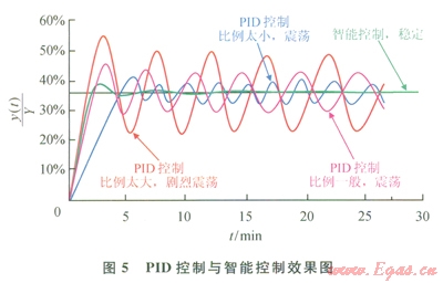 可見,采用智能控制,可使偏差快速穩(wěn)定收斂,當(dāng)[å|e(t)|/n]/Yset≥5%時(shí),采用固定比例控制,當(dāng)[å|e(t)|/n]/Yset≤5%時(shí),采用一定時(shí)間(大約0.5個(gè)波動(dòng)周期)相對(duì)偏差絕對(duì)值的均值(10/Yset)[ å|e(t)|/n]作為改變控制量的隨機(jī)變動(dòng)系數(shù),智能系數(shù)Kint,與E(t)在5%以下時(shí)呈線性遞增關(guān)系,控制量u(t)與E(t)呈非線性遞增關(guān)系。