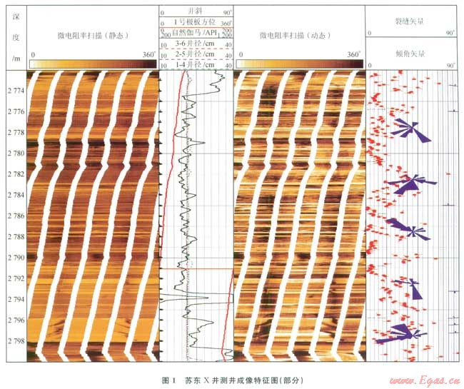 從大量巖心觀察表明,蘇里格氣田主要發(fā)育高角度裂縫、垂直裂縫。同時廣泛分布的低角度斜層理在一定程度上也有利于網(wǎng)狀縫的形成。在顯微鏡下可見到微裂縫及破裂縫。從成像測井資料來看,發(fā)育有一定量的天然裂縫,就蘇東X井而言(圖1),盒8段發(fā)育天然裂縫l7條,平均0.068條/m;山l段共發(fā)育天然裂縫23條,平均0.276條/m??傮w來說,蘇里格氣田致密砂巖儲層天然裂縫部分發(fā)育。
