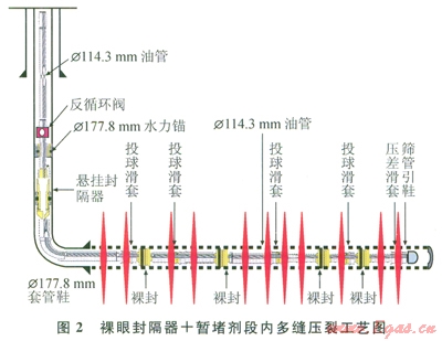 段內(nèi)多縫體積壓裂可以有效動用不同滲透率級別層段,在儲層中形成一定程度的復(fù)雜縫網(wǎng),進(jìn)一步增加改造體積,從而提高單井產(chǎn)量和采收率[9-10]。具體做法是在水平井裸眼完井條件下一次性下入水平井裸眼分段壓裂管柱,段內(nèi)加暫堵劑實現(xiàn)段內(nèi)多縫,逐級投球打開滑套并封堵下層油管,實現(xiàn)水平井裸眼段多級多段壓裂改造規(guī)模(圖2)。