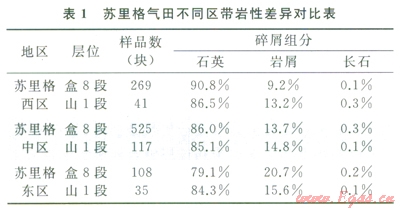 富含石英或者碳酸鹽巖等脆性礦物的儲層有利于產(chǎn)生復(fù)雜縫網(wǎng),沉積物源研究表明,山西一石盒子期,盆地北部存在兩大物源區(qū),西部為中元古界富石英物源區(qū);東部為太古界相對貧石英物源區(qū)。受物源控制,區(qū)帶間巖石類型存在明顯差異。蘇里格氣田由兩到東石英含量依次減少,巖屑含量依次增加。從石英含量來看,西區(qū)和中區(qū)石英含量相對較高,有利于實現(xiàn)體積壓裂(表1)。