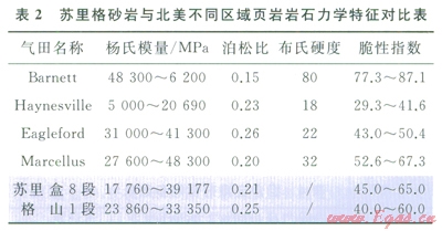 與北美頁巖氣相比,蘇里格氣田主力層20塊巖心做巖石力學(xué)實驗,單軸抗壓強(qiáng)度都在20MPa以上,抗拉強(qiáng)度基本在3~9MPa之間,盒8段楊氏模量17760~3917 MPa;泊松比0.21,山l段楊氏模量23860~33350MPa;泊松比0.25,泊松比較低。