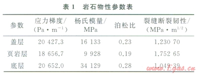 A井垂深2380m,水平井段長l828m,目標(biāo)頁巖層在2370~2397m,層厚27m,基質(zhì)滲透率為0.002mD,各層巖石物性參數(shù)如表1所示;本井共進(jìn)表1巖石物性參數(shù)表行了七級清水壓裂,每一級有5簇射孔段,每一簇含8個射孔孔眼;選擇100目石英砂作為支撐劑,假設(shè)支撐劑在所有裂縫中均勻分布,沉降速率為1.27mm/min。兩個模型均假設(shè)縫網(wǎng)由兩簇分別垂直于最大、最小水平主應(yīng)力的垂直縫組成,不含水平縫。