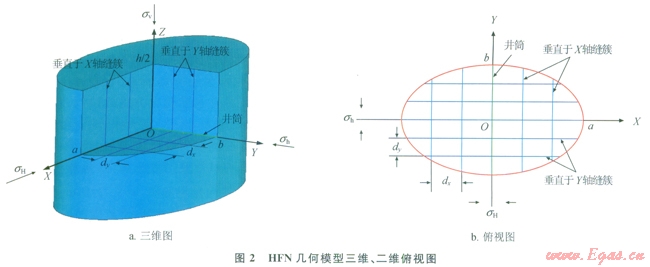 HFN模型考慮了壓裂過程中改造體積的實時擴(kuò)展以及施工參數(shù)的影響,能夠?qū)σ淹瓿蓧毫堰M(jìn)行縫網(wǎng)分析,同時可以基于該分析對之后的壓裂改造方案進(jìn)行二次優(yōu)化設(shè)計。其不足之處在于模擬縫網(wǎng)幾何形態(tài)較為簡單,需借助于地球物理技術(shù)的幫助獲取部分參數(shù),同時由于不能模擬水平裂縫的起裂及擴(kuò)展問題,及忽略了濾失問題,所以使用時具有較大的局限性。