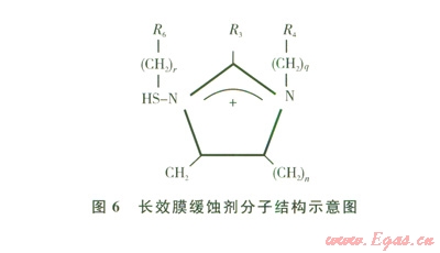 通過改進(jìn)緩蝕劑分子結(jié)構(gòu),引入巰基基團(tuán),增強(qiáng)了緩蝕劑的吸附成膜性能,與國外同類產(chǎn)品相比緩蝕劑的膜持久時(shí)間由10 d提高到45 d。應(yīng)用了清管器預(yù)膜技術(shù),解決了長距離管線緩蝕劑均勻保護(hù)和殘余藥劑回收的技術(shù)難題。首次在四川龍崗高含硫氣田進(jìn)行了全流程管線整體應(yīng)用清管器預(yù)膜技術(shù)。圖6為長效膜緩蝕劑分子結(jié)構(gòu)示意圖。