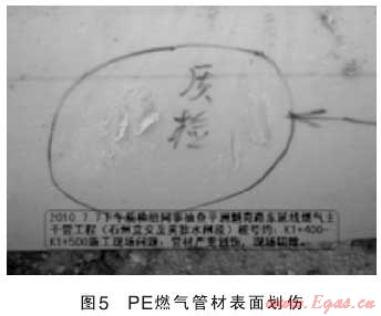 在燃氣管道施工過程中,因施工單位人員、現(xiàn)場監(jiān)理人員以及建設(shè)單位現(xiàn)場管理人員對燃氣管道安裝施工質(zhì)量監(jiān)管不到位,施工經(jīng)驗不足或者根本不懂燃氣管道施工的重要性,不按照燃氣行業(yè)國家規(guī)范和行業(yè)標準嚴格操作和監(jiān)管,產(chǎn)生一系列施工質(zhì)量隱患。如鋼管防腐處理不到位、閥井內(nèi)波紋補償器受外力安裝偏斜或不同軸,電熔管件焊接焊口冷卻采取沖水冷卻方式,PE管道運輸、搬運造成管壁劃傷嚴重超標等人為因素,給城市燃氣管道安全運行種下了一顆顆定時炸彈(如圖3、4、5)。