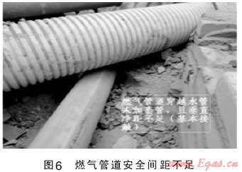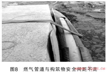 主要表現(xiàn)在:1)對壓力管道安全知識缺乏和對壓力管道有關(guān)介質(zhì)(如液化石油氣和天然氣)安全知識貧乏;2)對安全距離重視不足,壓力管道與其它設(shè)施距離不符合規(guī)范(GB50028-2006)相關(guān)要求,壓力管道與生活設(shè)施安全距離不足;3)無安全操作制度或有規(guī)定要求不嚴格執(zhí)行(如圖6、7、8)。