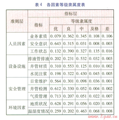 本研究中,研究人員對CNG地下儲氣井的安全評價除了一般性的理論分析外,還建立了指導(dǎo)地下儲氣井安全評價的模糊層次分析模型。該模型的優(yōu)點是:用層次分析法建立各種安全因素指標(biāo)集,避免了確定權(quán)重時的主觀片面性;綜合模糊數(shù)學(xué)理論與層次分析法,將定性分析與定量分析相結(jié)合,使主觀估計客觀化,尋求到了理論分析與工程實際的結(jié)合點;采用比較成熟的模糊層次分析法進行評價,較好地解決了工程項目中模糊因素的度量[9]。