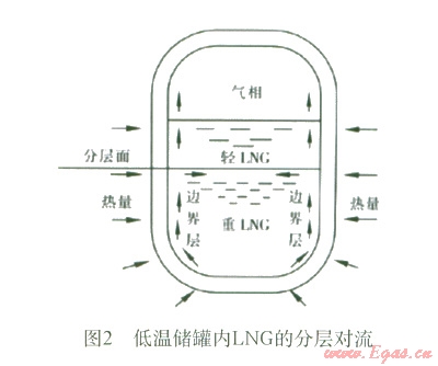 渦旋主要是由于在向盛有LNG的低溫儲(chǔ)罐中充注新的LNG液體或者LNG中氮蒸發(fā)而使儲(chǔ)罐內(nèi)的液體發(fā)生分層。分層液體在儲(chǔ)罐周邊漏熱的作用下,形成各自獨(dú)立的自然對(duì)流循環(huán),進(jìn)而使各層液體的密度不斷發(fā)生變化,見(jiàn)圖2。當(dāng)相鄰兩層液體的密度近似相等時(shí),兩個(gè)液層就會(huì)發(fā)生強(qiáng)烈混合,下層積聚的熱量突然釋放出來(lái),同時(shí)伴隨著LNG表面蒸發(fā)率的驟增,幾乎可達(dá)到正常情況下蒸發(fā)率的250倍。蒸發(fā)產(chǎn)生的大量氣體,引起儲(chǔ)罐內(nèi)壓力突然增大,導(dǎo)致大量天然氣排空,造成嚴(yán)重浪費(fèi),甚至可能毀壞儲(chǔ)罐及工藝系統(tǒng),引起爆炸或火災(zāi),嚴(yán)重威脅人員和財(cái)產(chǎn)安全。