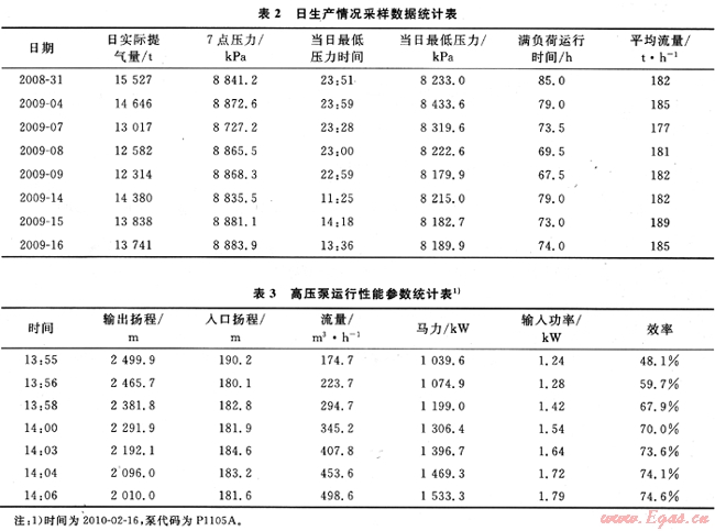1) 繼續(xù)適量增大生產(chǎn)線的氣化能力。表2為日生產(chǎn)數(shù)據(jù)統(tǒng)計(jì)表,由表2可知,單臺氣化裝置的平均輸出流量基本在180t/h左右,如果ORV的海水進(jìn)出口溫差小于5℃,增加高壓泵的流量可繼續(xù)增加氣化生產(chǎn)線的氣化能力。表3為高壓泵運(yùn)行性能參數(shù)統(tǒng)計(jì)表。由表3可知,在流量為500m3/h時(shí),高壓泵的功率在額定功率1800kW以內(nèi)。如果將氣化設(shè)備低壓泵、高壓泵和0RV的流量分別運(yùn)行在500、450、430m3/h左右,設(shè)備仍運(yùn)行在最佳效率區(qū)間且運(yùn)行參數(shù)正常。