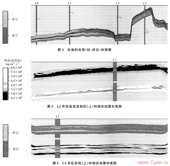 對(duì)比圖1~4,可以看出疊前隨機(jī)反演結(jié)果的垂直分辨率較疊前AVA同步反演結(jié)果有很大提高,地震資料無(wú)法分辨的L2井區(qū)的兩套薄砂層(圖5)和L3井區(qū)的砂泥互層(圖6)在反演結(jié)果中均表現(xiàn)十分清楚。該氣組儲(chǔ)層是低水位期在內(nèi)陸架環(huán)境中形成的近源風(fēng)暴席狀沙沉積,分布較穩(wěn)定。而反演結(jié)果中儲(chǔ)層橫向連續(xù)性也很好,符合該區(qū)的沉積相分布特征;同時(shí)上下層位的接觸關(guān)系與原始地震資料也吻合很好,進(jìn)一步驗(yàn)證了預(yù)測(cè)的可靠性。反演成果在該氣田的開(kāi)發(fā)井設(shè)計(jì)優(yōu)化中得到了實(shí)際應(yīng)用,并為今后的氣田開(kāi)發(fā)實(shí)施提供了有力的資料,有利于降低開(kāi)發(fā)風(fēng)險(xiǎn)、提高效率。