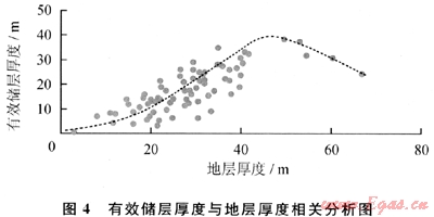 川東石炭系有效儲(chǔ)層厚度與地層厚度有一定的相關(guān)性。在地層厚度小于45m時(shí),有效儲(chǔ)層的厚度與地層厚度多成正相關(guān)關(guān)系;而在地層厚度大于45m時(shí),地層厚度與有效儲(chǔ)層的關(guān)系相反(圖4)。由此可知,石炭系厚度小于10m的地區(qū),儲(chǔ)層多小于5m;地層厚度小于5m的地區(qū),多為致密層,可以成為巖性圈閉與地層圈閉的側(cè)向封堵層。