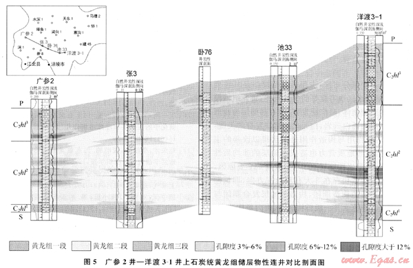 石炭系儲(chǔ)層具有較強(qiáng)的非均質(zhì)性與不連續(xù)性特征。其白云巖儲(chǔ)層的厚度及物性變化很快(圖5),雖然石炭系都發(fā)育儲(chǔ)層,但儲(chǔ)層發(fā)育的層位并不相同,有的呈現(xiàn)不連續(xù)特征。石炭系黃龍組單個(gè)白云巖儲(chǔ)層厚度多在1~5m,個(gè)別疊合后可達(dá)10m厚,這顯示石炭系存在廣泛發(fā)育局限小型巖性圈閉的可能性。