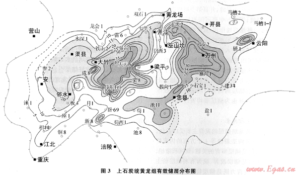 川東石炭系儲(chǔ)層分布廣泛,有效儲(chǔ)層多在黃龍組地層厚度大于10m的石炭系分布區(qū)[17~18]。有利的白云巖儲(chǔ)層(孔隙度大于3%)主要發(fā)育于開(kāi)江古隆起的兩側(cè)地區(qū),厚度可達(dá)40m(圖3);在石炭系發(fā)育較薄的西南、東南與東北部地區(qū),白云巖儲(chǔ)層多小于10m;在西北部龍會(huì)達(dá)州地區(qū),石炭系的地層厚度雖然較厚,但是主要發(fā)育石灰?guī)r,儲(chǔ)層基本不發(fā)育。