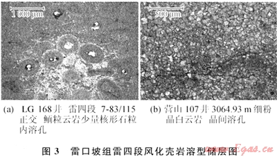發(fā)育風(fēng)化殼巖溶型白云巖和顆粒白云巖2類儲層,前者見于盆地中部地區(qū),以LG雷四段為代表;后者發(fā)育于雷一段和雷三段,以中壩氣田最為典型[17],下面分別討論其特點(diǎn)。