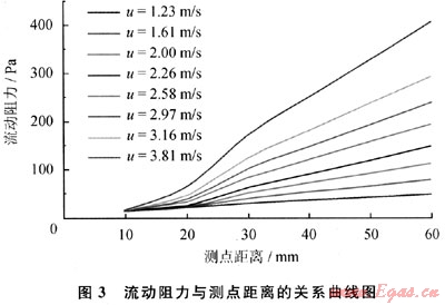 由式(1)可以看出,阻力應該與距離成正比。分析造成上述實驗現(xiàn)象的原因是:實驗中放置泡沫陶瓷的鋼管與高壓氮氣瓶連接需要變徑,氣流在異徑處附近的流速分布不是充分發(fā)展紊流,流速分布不對稱,有畸變,還可能有漩渦、回流,在測點處的流速偏小,曲線向速度較低的曲線靠近,形成了圖3中與測點A的距離小于30mm時的流動阻力形態(tài)。因此,在以下分析中,僅對測點距離大于30mm的數(shù)據(jù)進行分析,即對測點距離小于30mmm的泡沫陶瓷流動進行調整,以此來消除異徑對測量結果的影響。