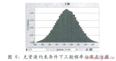 可知,模擬工期分布范圍為[177,214],平均值為200;由表3可知,資源約束條件下蒙特卡洛計(jì)算所得模擬工期分布范圍為[172,210],平均值為194,該方法所得模擬工期方差為l6,小于無(wú)資源約束條件下模擬工期方差21。這是因?yàn)榭紤]資源約束條件后,各活動(dòng)歷時(shí)隨機(jī)浮動(dòng)的同時(shí)受到了資源的約束,所以其浮動(dòng)變小了,對(duì)項(xiàng)目工期的浮動(dòng)的貢獻(xiàn)有了一定的消減作用,充分體現(xiàn)了資源在項(xiàng)目中的重要地位。同時(shí),本項(xiàng)目實(shí)際完成時(shí)間為193天,顯然資源約束條件下模擬工期平均值更接近實(shí)際項(xiàng)目工期。因此,從IT項(xiàng)目實(shí)際情況出發(fā),考慮資源約束的模擬能更準(zhǔn)確地預(yù)測(cè)項(xiàng)目工期,有更強(qiáng)的實(shí)用性。