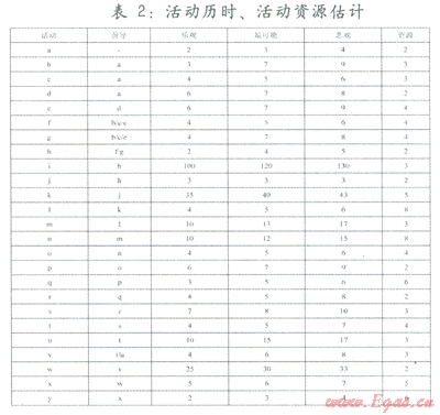根據(jù)ERP項(xiàng)目實(shí)施過程和各階段活動(dòng)之間的邏輯關(guān)系,基于專家三點(diǎn)評(píng)估得到的活動(dòng)歷時(shí)、活動(dòng)資源單位如表2所示: