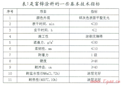 表1所列性能中的耐鹽水性(5%NaCl,72h),試板可以單面涂敷,不封邊封背,常溫下在5%NaCl溶液中,浸泡72h后觀察,在無涂層的金屬表面無可見的腐蝕斑點(diǎn),這是該富鋅涂料最突出的防腐性能。