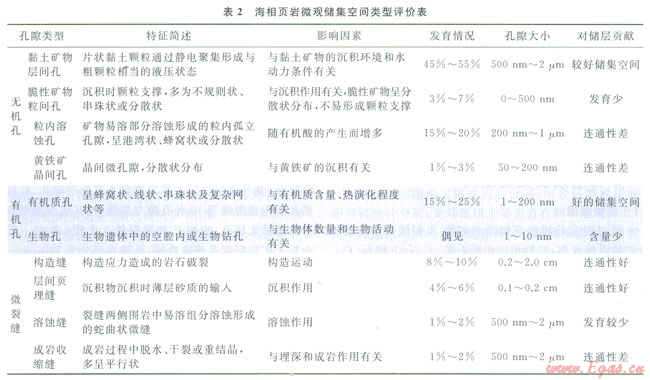 通過(guò)巖心、巖石顯微薄片和場(chǎng)發(fā)射掃描電鏡下觀察,龍馬溪組頁(yè)巖孔隙和微裂縫十分發(fā)育。據(jù)粗略觀察統(tǒng)計(jì),龍馬溪組頁(yè)巖主要發(fā)育黏土礦物層間孔、有機(jī)質(zhì)孔和構(gòu)造裂縫等10種孔隙與裂縫,按其成因類型劃分為基質(zhì)無(wú)機(jī)孔、有機(jī)孔和微裂縫3大類(表2)。其中黏土礦物層間孔連通性好,孔隙直徑介于100nm~2mm,黏土礦物層間孔占總孔隙的45%~55%;有機(jī)質(zhì)孔主要發(fā)育在富有機(jī)質(zhì)頁(yè)巖層段,孔隙直徑介于50~500nm的數(shù)量眾多,有機(jī)質(zhì)孔占總孔隙的15%~25%;構(gòu)造裂縫多數(shù)被膠結(jié)物充填,不具備儲(chǔ)集能力,頁(yè)巖氣的滲流通道主要為微裂隙[6-7],但方解石充填縫在人工壓裂中可重新開(kāi)啟,提高頁(yè)巖儲(chǔ)層滲透性。