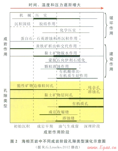 頁(yè)巖中孔隙的形成受多種因素控制,包括沉積原始礦物組成、結(jié)構(gòu)、構(gòu)造、有機(jī)質(zhì)含量、流體、水文條件以及沉積速率和埋藏深度[13]。其中,成巖演化作用是重要的影響因素,在不同成巖作用階段孔隙演化特征不同(圖2)。沉積初期主要是機(jī)械堆積成岡的粒間孔。隨著埋深及上覆地層壓力增大,松散沉積物固結(jié)成巖,地層中的流體快速排出,有機(jī)質(zhì)開(kāi)始生物降解。粒間孔逐漸減少,塑性顆粒變形充填到粒間孔中加劇了孔隙的損失[13]。隨埋深進(jìn)一步增加,進(jìn)入大量生排烴階段(油氣生成窗),生烴后有機(jī)質(zhì)體積縮小以及氣體生成時(shí)體積膨脹造成有機(jī)質(zhì)中產(chǎn)生大量孔隙[14],同時(shí)在生烴的過(guò)程中產(chǎn)生大量的有機(jī)酸、CO2和水。易溶礦物顆粒(如方解石、長(zhǎng)石)發(fā)生溶蝕作用形成溶蝕孔或溶蝕縫。同時(shí)黏土礦物發(fā)生一系列成巖變化,以蒙脫石向伊利石(或綠泥石)的轉(zhuǎn)化最為重要。在這個(gè)變化過(guò)程中,伴隨著礦物結(jié)構(gòu)和化學(xué)組成的變化,析出大量層間水。由于黏土礦物脫水作用,形成了大量的黏土礦物層間孔和成巖收縮縫。有機(jī)酸溶解的鈣質(zhì)礦物和黏土礦物脫水析出的鈣質(zhì)礦物易在溶蝕縫、成巖收縮縫及層間頁(yè)理縫中形成鈣質(zhì)沉淀,微裂縫多被方解石充填。