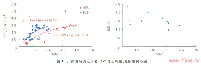 有機(jī)質(zhì)利于頁(yè)巖氣的吸附[15],有機(jī)質(zhì)含量越高吸附氣量越大(圖3-a),同時(shí)有機(jī)質(zhì)還有利于孔隙的形成[16]。有機(jī)質(zhì)孔的形成是在油氣生成過(guò)程中,有機(jī)質(zhì)體積縮小及氣體體積膨脹[17-18],并隨著地溫的升高及熱成熟度的增加隨之增多[12,19]。有研究發(fā)現(xiàn),在熱裂解作用下,有機(jī)質(zhì)損失35%可形成4.9%的凈有效儲(chǔ)集空間[20]。但有機(jī)質(zhì)豐度與頁(yè)巖孔隙度并不存在相關(guān)關(guān)系(圖3-b),這與有機(jī)質(zhì)孔之間相互連通性較差有關(guān)。