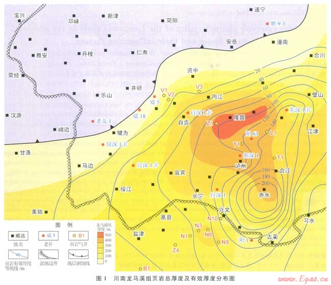 通過(guò)對(duì)川南地區(qū)鉆井巖心分層,結(jié)合區(qū)域地層調(diào)研資料統(tǒng)計(jì)分析,龍馬溪組主要發(fā)育在黔中隆起以北、川中隆起以南的較深水的非補(bǔ)償性缺氧環(huán)境中。受黔中古隆起的影響,在南部靠近古隆起邊緣的地區(qū)沉積厚度較薄,向北東方向厚度增大,處于沉積中心附近的頁(yè)巖厚度最大。在川中古隆起,龍馬溪組受地層抬升遭受剝蝕,在靠近古隆起邊緣的地區(qū)富含有機(jī)質(zhì)頁(yè)巖厚度較薄,向南東方向厚度增大。龍馬溪組整體厚度雖然較大,但有利層段厚度并不大(圖1)。