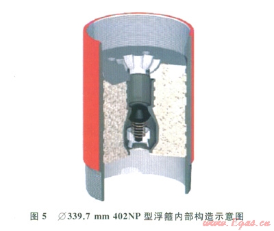 Æ339.7mm和Æ508.0mm的套管鉆井所使用的浮箍,前者的型號(hào)為402NP型(圖5),后者的型號(hào)為402型。這2種浮箍的最大特點(diǎn)是:超密Ⅲ型(Sure-Seal 3TM)單流閥,性能優(yōu)良,可以耐受長(zhǎng)時(shí)間大排量鉆井液的沖刷。另外402NP型有l個(gè)花瓣?duì)畹某薪颖P,可以保證在下一次開(kāi)鉆被鉆掉時(shí),膠塞不發(fā)生旋轉(zhuǎn)[12-14]。