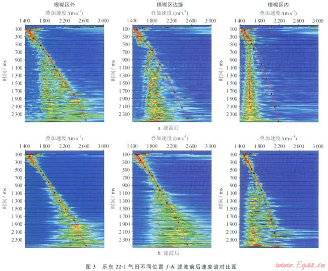 基于上述認(rèn)識(shí),加強(qiáng)了對(duì)全區(qū)的地震速度譜的解釋分析。分析發(fā)現(xiàn)“模糊區(qū)”外速度譜能量團(tuán)集中,質(zhì)量較好,解釋可靠;進(jìn)入“模糊區(qū)”后,速度譜質(zhì)量明顯降低,看不到一次波的能量團(tuán),特別是中心部位只有多次波的能量團(tuán)出現(xiàn),無法進(jìn)行速度解釋(圖3)。分析認(rèn)為該區(qū)淺層氣十分發(fā)育,淺層氣與其圍巖的波阻抗差別很大,從而形成很強(qiáng)的反射。淺氣層與淺氣層之間、淺氣層與海底之間就產(chǎn)牛了很強(qiáng)的層間多次波,致使在地震速度譜上一次波的能量被掩蓋,譜上顯示出的全是多次波的能量團(tuán)。因此壓制多次波便成為精細(xì)速度分析的首要任務(wù)。經(jīng)過多次試驗(yàn),f-K濾波。叫對(duì)壓制本區(qū)的多次波效果較好(圖3)。經(jīng)濾波處理后,“模糊區(qū)”外正常地層的速度譜能量團(tuán)更清楚;剛進(jìn)入“模糊區(qū)”的速度譜也出現(xiàn)了較集中的一次波的能量團(tuán),能夠準(zhǔn)確地進(jìn)行解釋;“模糊區(qū)”中心的速度譜雖然仍有較強(qiáng)的多次波能量團(tuán)出現(xiàn),但一次波的能量團(tuán)已清楚地出現(xiàn)在速度譜上,完全可以進(jìn)行可靠的速度解釋。