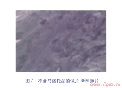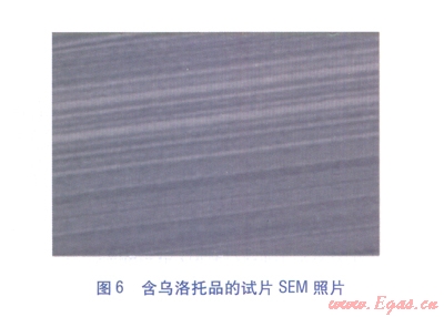 當(dāng)旋轉(zhuǎn)掛片腐蝕實驗結(jié)束后,從溶液中取出金屬碳鋼掛片,對試片分別清洗后粘在貼有雙面膠的試樣臺上。為了保證試片表面各處都能夠均勻?qū)щ?,避免因電荷積累造成尖端放電而影響成像質(zhì)量,測試前要對試片進(jìn)行噴金(Au)處理。噴金后置于KYKY28008型掃描電子顯微鏡下觀察,加速電壓為15kV,放大倍數(shù)為5000。觀察結(jié)果表明,含緩蝕劑烏洛托品的5%羥基亞乙基二膦酸清洗劑中,碳鋼試片的腐蝕痕跡不明顯,顯示出較完整的基材表面,見圖6;不含緩蝕劑的清洗劑中金屬碳鋼試片表面出現(xiàn)了一定的坑狀腐蝕,試片表面稍微粗糙,見圖7。