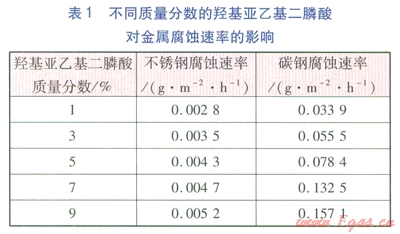 由表l可見,隨著羥基亞乙基二膦酸的質(zhì)量分?jǐn)?shù)逐漸增加,不銹鋼的腐蝕速率增大的幅度比較平緩,說明影響不太明顯;對碳鋼的腐蝕速率影響比較大,特別是當(dāng)羥基亞乙基二膦酸的質(zhì)量分?jǐn)?shù)超過5%以后,碳鋼的腐蝕速率增長幅度非常明顯,當(dāng)質(zhì)量分?jǐn)?shù)達(dá)到9%時與5%時相比增長近一倍。因此,實際清洗時把清洗主劑羥基亞乙基二膦酸的質(zhì)量分?jǐn)?shù)控制在5%較為合適。