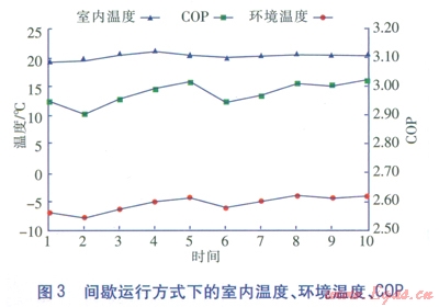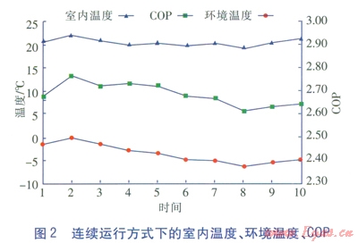 連續(xù)運行方式的實驗時間為l個月,每天運行24h,每小時監(jiān)測記錄一次。以每3天為單位取室內(nèi)溫度、COP、環(huán)境溫度平均值,結(jié)果見圖2。其中橫坐標(biāo)值1代表實驗的第l~3天,2代表實驗的4~6天,依此類推。在此運行模式期間,平均室外溫度為-3.47℃,最低日平均溫度為-6.6℃,最高日平均溫度為0.0℃,太陽輻射平均日總量為2353W/m2,集熱器平均日集熱總量為l411.8W/m2,室內(nèi)溫度在19.2~22.7℃范圍內(nèi)變化(平均達(dá)21.15℃),系統(tǒng)的平均COP達(dá)2.689,COP最低為2.614,最高為2.782。從圖2可知,系統(tǒng)連續(xù)運行時的供暖溫度始終在人體舒適的溫度范圍內(nèi)波動,但是系統(tǒng)的COP值較小,說明能耗還可以進(jìn)一步降低。