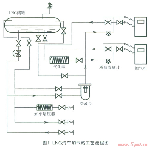 LNC汽車(chē)加氣站具有卸車(chē)、儲(chǔ)存、增壓、加氣等工藝過(guò)程,南此形成了相應(yīng)的T藝流程,見(jiàn)圖l。