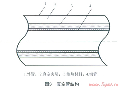LNG槽車(chē)到站后,通常通過(guò)低溫泵法或增壓器法對(duì)槽車(chē)內(nèi)LNG增壓后將LNG卸入儲(chǔ)罐內(nèi)。不論采用哪種方法,LNG必須通過(guò)低溫管道進(jìn)行輸送,在輸送過(guò)程中,LNG將吸收外界環(huán)境熱量而氣化,產(chǎn)生BOG。為了減少BOG的產(chǎn)生,通常利用兩種方法對(duì)低溫管道進(jìn)行保冷處理,即絕熱材料包覆法和真空管法,這兩種方法結(jié)構(gòu)如圖2、3所示[5]。