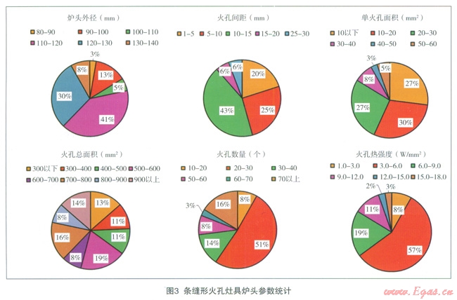 本文通過對(duì)65臺(tái)目前中國(guó)燃具市場(chǎng)上常見的民用大氣式燃?xì)庠罹郀t頭進(jìn)行調(diào)研,著重統(tǒng)計(jì)分析了目前中國(guó)灶具廠商出廠的各類灶具爐頭的不同火孔類型、火孔尺寸、火孔間距、火孔數(shù)量、火孔熱強(qiáng)度以及灶具額定熱負(fù)荷等數(shù)據(jù),并對(duì)部分樣本灶具進(jìn)行不同氣質(zhì)情況下的熱效率和CO排放性能分析,以驗(yàn)證不同爐頭設(shè)計(jì)對(duì)氣源氣質(zhì)變化的適應(yīng)能力。