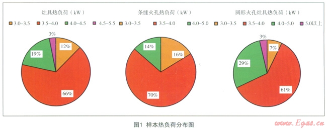 樣本選取主要選擇國(guó)內(nèi)市場(chǎng)知名度較高的幾個(gè)燃?xì)庠钇放平鼛啄晖瞥龅男吞?hào),基本代表各制造商日前的設(shè)計(jì)、加工制造水平。嵌入式灶具因其外觀漂亮,便于清潔而日益成為主流,臺(tái)式灶因其價(jià)格優(yōu)勢(shì)還占有一定的市場(chǎng)比例;燃燒器的火孔形式,選擇常用的圓形火孔和旋縫火孔,圓形火也因其設(shè)計(jì)資料完善且加工簡(jiǎn)單而廣為采用,另一方面,近來在一些知名廠家的推動(dòng)下,旨在利用旋轉(zhuǎn)氣流來增強(qiáng)傳熱、提高效率的三維旋轉(zhuǎn)條縫形火孔開始逐漸流行起來。綜合上述因素,本文共選取了65臺(tái)樣本,其中包括52臺(tái)嵌入式灶和13臺(tái)臺(tái)式灶,又分為28臺(tái)網(wǎng)形火孔灶和37臺(tái)旋縫火孔灶。