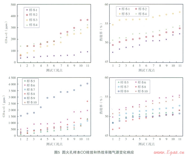 對(duì)10臺(tái)圓形火孔樣本的CO排放和熱效率性能在11種氣源情況下的響應(yīng)分析列于圖5。其中,樣本1~4所有測(cè)試工況下的CO排放響應(yīng)值均在國(guó)標(biāo)要求的500×10-6以下,且除樣本l的5個(gè)測(cè)試工況外,其他所有測(cè)試工況點(diǎn)的熱效率響應(yīng)均在國(guó)標(biāo)規(guī)定的50%以上。說明這4臺(tái)樣本的適應(yīng)能力較強(qiáng),能較好的應(yīng)對(duì)氣源氣質(zhì)變化。統(tǒng)計(jì)4臺(tái)樣本的爐頭設(shè)計(jì)發(fā)現(xiàn),設(shè)計(jì)火孔熱強(qiáng)度為7.2W/mm2 ~8.4W/mm2,爐頭外徑選擇在125mm~135mm內(nèi),設(shè)計(jì)火孔總面積為350mm2~430mm2,e值分布在30~40之間。樣本5~10的CO排放響應(yīng)表現(xiàn)并不理想,其中樣本6和9所有測(cè)試工況CO排放均在500×10-6以上,其他4臺(tái)樣本過半數(shù)測(cè)試工況點(diǎn)CO排放超標(biāo);熱效率響應(yīng)方面除樣本8和9外,其他4臺(tái)樣本表現(xiàn)尚屬理想;但若同時(shí)考慮CO排放和熱效率,則發(fā)現(xiàn)樣本5~10的沒計(jì),均是在保證熱效率達(dá)標(biāo)的前提下犧牲了CO排放,實(shí)際應(yīng)用中不建議采用這類“高效率高排放”的燃?xì)庠?。統(tǒng)計(jì)6臺(tái)樣本的爐頭設(shè)計(jì)發(fā)現(xiàn),其中5臺(tái)樣本的設(shè)計(jì)火孔熱強(qiáng)度均大于llW/mm2,最大達(dá)到了l5.2W/mm2,爐頭外徑則集中在l20mm~130mm和l40mm~150mm兩個(gè)范圍,設(shè)計(jì)火孔總面積為260mm2~300mm2,e值整體較大分布在40~65之間。故,如圖4所示高火孔熱強(qiáng)度易出現(xiàn)CO排放問題;爐頭直徑過大則會(huì)導(dǎo)致中心火焰二次空氣供給變差,燃燒效率降低,污染物排放不理想;e值選擇過大,則反映出爐頭火孔分布不合理,火孔過于分散,火焰較硬,傳熱效果變差影響熱效率。