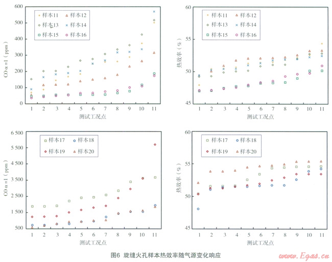 對(duì)10臺(tái)旋縫火孔樣本的CO排放和熱效率性能在11種氣源情況下的響應(yīng)分析列于圖6。其中,樣本11~16基本所有測(cè)試工況下的CO排放響應(yīng)值均在國(guó)標(biāo)要求的500×10-6以下,且除樣本l5和16外,其他4臺(tái)樣本的熱效率響應(yīng)基本均在國(guó)標(biāo)規(guī)定的50%以上。說明樣本ll~14這4臺(tái)樣本的適應(yīng)能力較強(qiáng),能較好的應(yīng)對(duì)氣源氣質(zhì)變化,統(tǒng)計(jì)其爐頭設(shè)計(jì)發(fā)現(xiàn),設(shè)計(jì)火孔熱強(qiáng)度為8.5W/mm2~ll.5W/mm2,爐頭外徑選擇在120mm~130mm內(nèi),設(shè)計(jì)火孔總面積為250mm2~350mm2,e值分布在35~45之間。樣本17~20的CO排放響應(yīng)表現(xiàn)并不理想,所有4臺(tái)樣本在所有測(cè)試工況下CO排放均在500×10-6以上;熱效率響應(yīng)方而4臺(tái)樣本表現(xiàn)尚屬理想;但若同時(shí)考慮CO排放和熱效率,則發(fā)現(xiàn)旋縫火孔樣本同樣出現(xiàn)網(wǎng)形火孔樣本的問題,均是在熱效率達(dá)標(biāo)的情況下CO排放嚴(yán)重超標(biāo)。統(tǒng)計(jì)樣本l5~20這6臺(tái)樣本的爐頭設(shè)計(jì)發(fā)現(xiàn),設(shè)計(jì)火孔熱強(qiáng)度偏小,均小于7W/mm2,最小達(dá)到了3.7W/mm2;爐頭外徑則集中在120mm~130mm之間,設(shè)計(jì)火孔總面積偏大,均大于440mm2,最大達(dá)到了832mm2,e值整體較大分布在10~30之間。綜合樣本15~20的爐頭設(shè)計(jì)統(tǒng)計(jì)數(shù)據(jù),火孔憩面積設(shè)計(jì)偏大且e值選擇偏小,則爐頭火孔分布過于集中,火焰易連焰變軟,二次空氣供給變差燃燒不完全,從而影響燃燒效率,增加污染物排放。