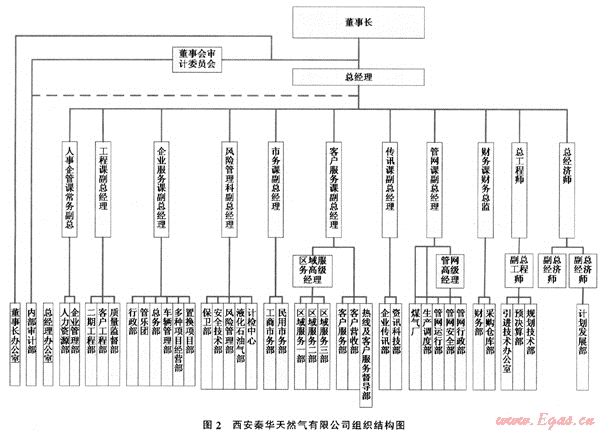 架構(gòu)重組后的部門設(shè)置以“使客戶滿意的流程”為中心,把同類業(yè)務(wù)整合到一起,這樣可以強(qiáng)化專業(yè)化管理,優(yōu)化專業(yè)技術(shù);優(yōu)化人力資源,減少勞動定員,避免同一專業(yè)崗位工作忙閑不均的問題;減少開資。降低消耗。提高極具設(shè)備、原材料、能源、技術(shù)等各種資源的綜合利用水平。重組后的西安秦華天然氣有限公司組織結(jié)構(gòu)圖如圖2所示。
