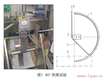 文章還需要特別糾正一個偏差,在國內相關行業(yè)標準也曾經對翻轉內襯的抗剝離強度作出過規(guī)定,該行標規(guī)定應對翻轉內襯修復后管道進行軸向剝離試驗并給出指標。在多年經驗的基礎上,經過論證和試驗研究,可以判斷出該技術標準規(guī)定值得商榷。最重要的原因在于進行軸向180°剝離試驗,無論剝離寬度是多少,通過粘合劑粘接在管道內壁上的內襯材料都存在一定弧度,軸向剝離時剝離點是在一條弧線上,而不在一個直線上,導致測試出來的內襯抗剝離強度值存在嚴重的偏差(測試值會比實際值高)。鑒于此,在相關的德國工業(yè)標準、行業(yè)規(guī)程和美國測試和材料標準里,都明確規(guī)定了材料的抗剝離強度應通過90°剝離試驗來進行測試。該測試過程如下: